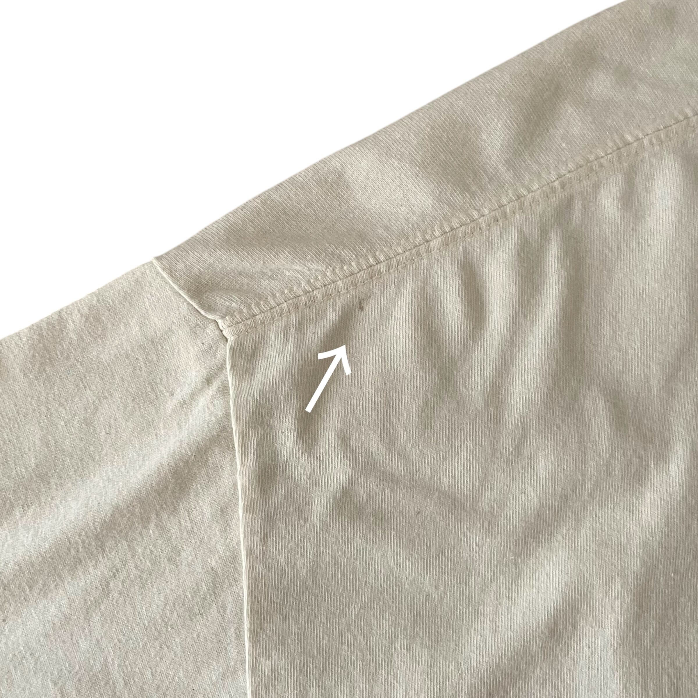 袖丈はひじ上1cm程度の丈感で、首周りは余裕があります