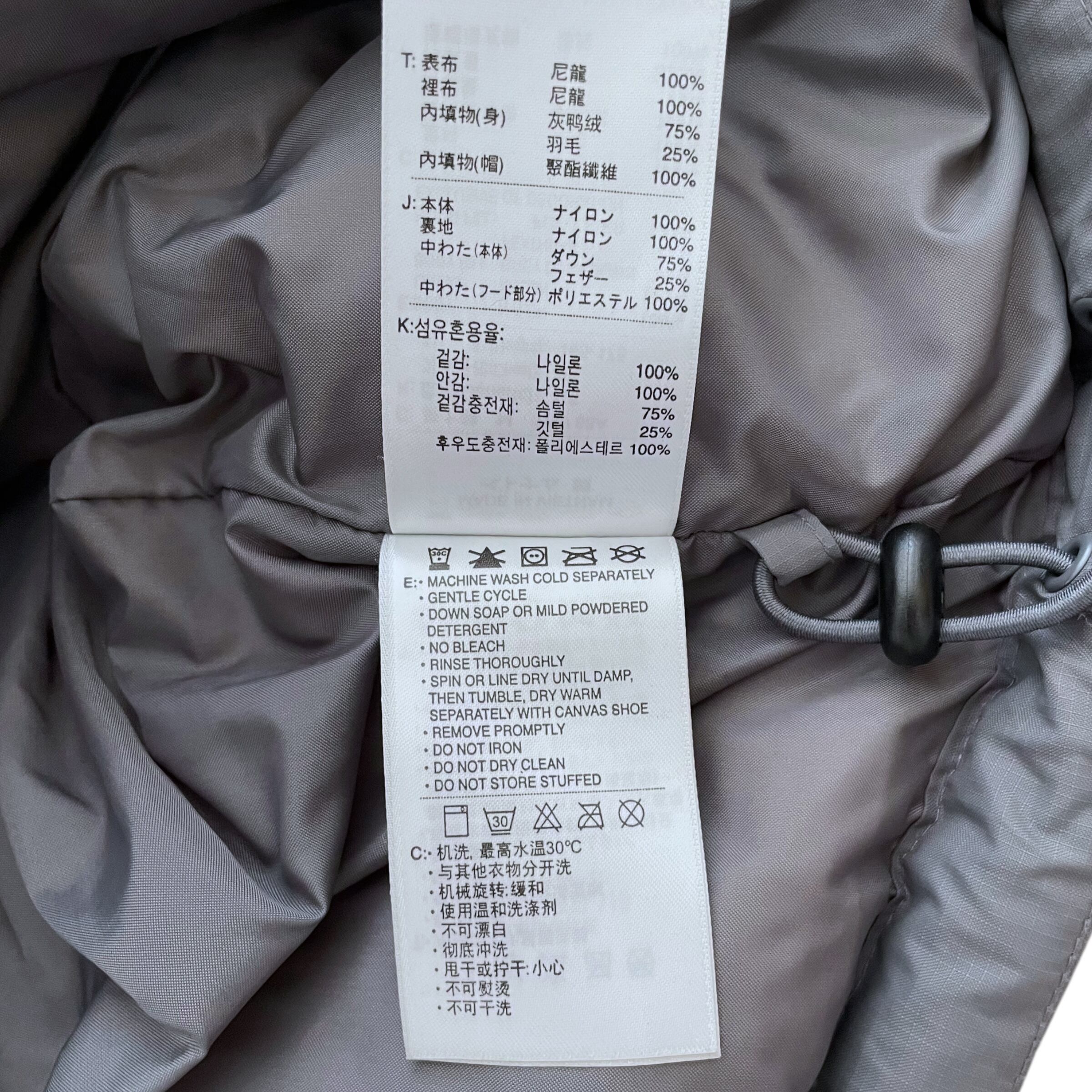 中わた ダウン75%、フェザー25%